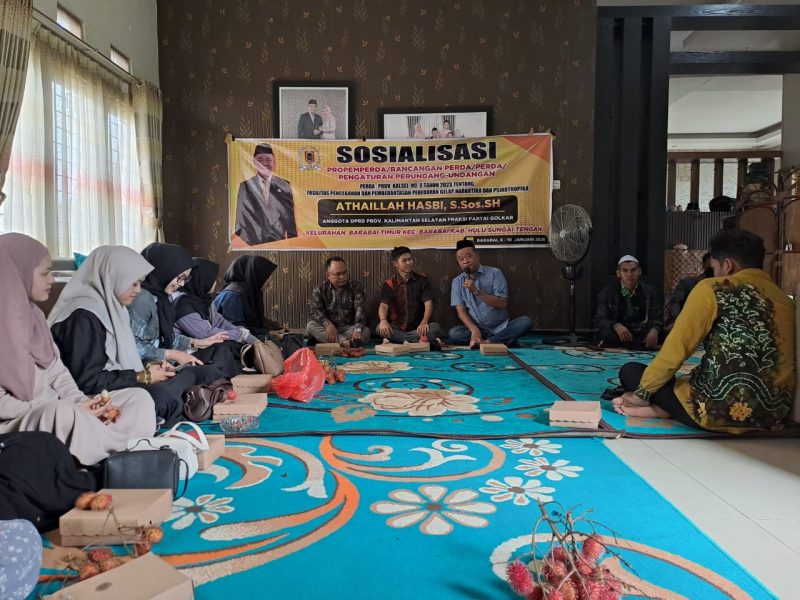 BARABAI, wasaka.id – Anggota DPRD Kalsel Fraksi Partai Golkar Athaillah Hasbi, menggencarkan sosialisasi Perda Nomor 8 Tahun 2023 dengan membentengi masyarakat dari ancaman peredaran gelap narkotika dan psikotropika.